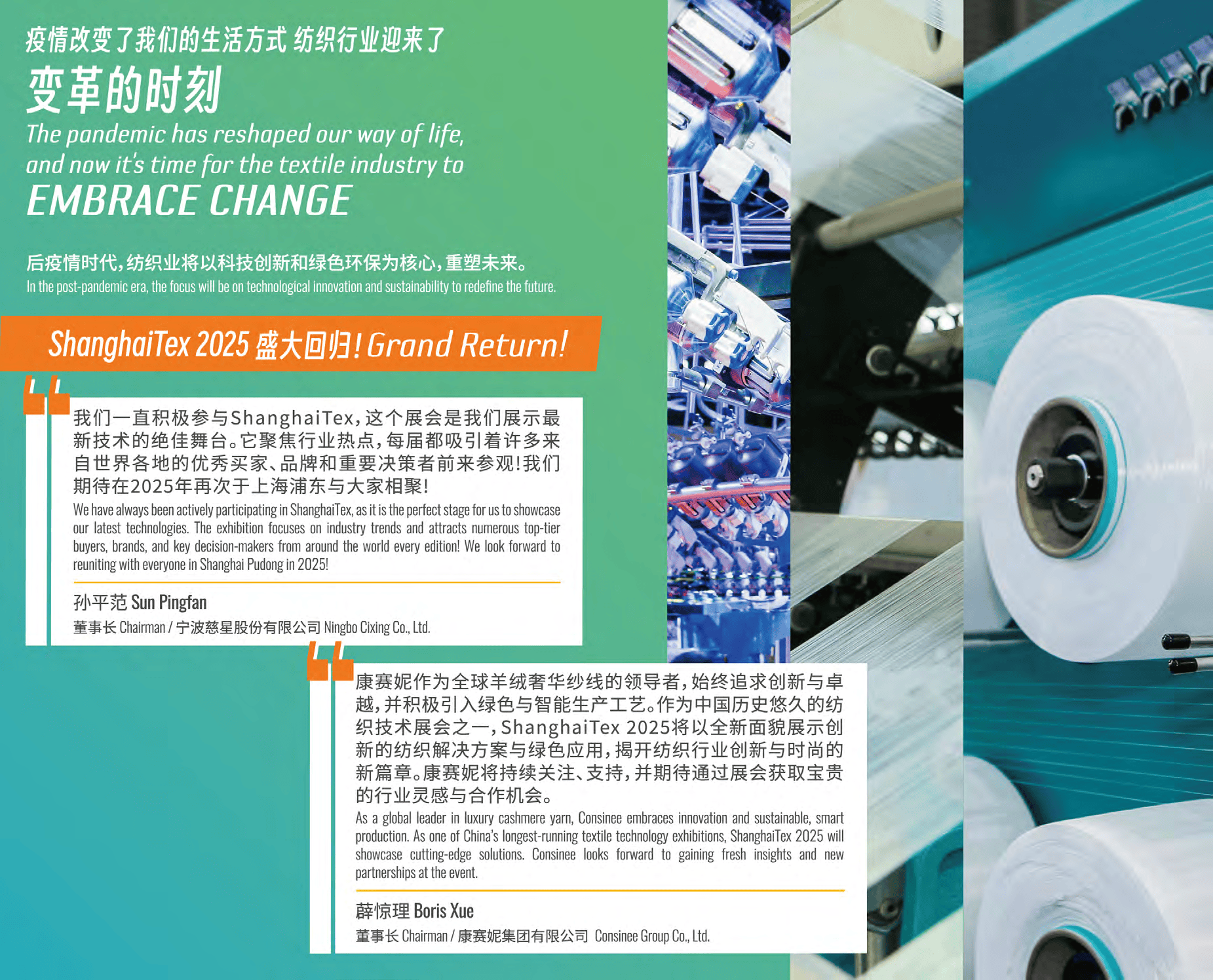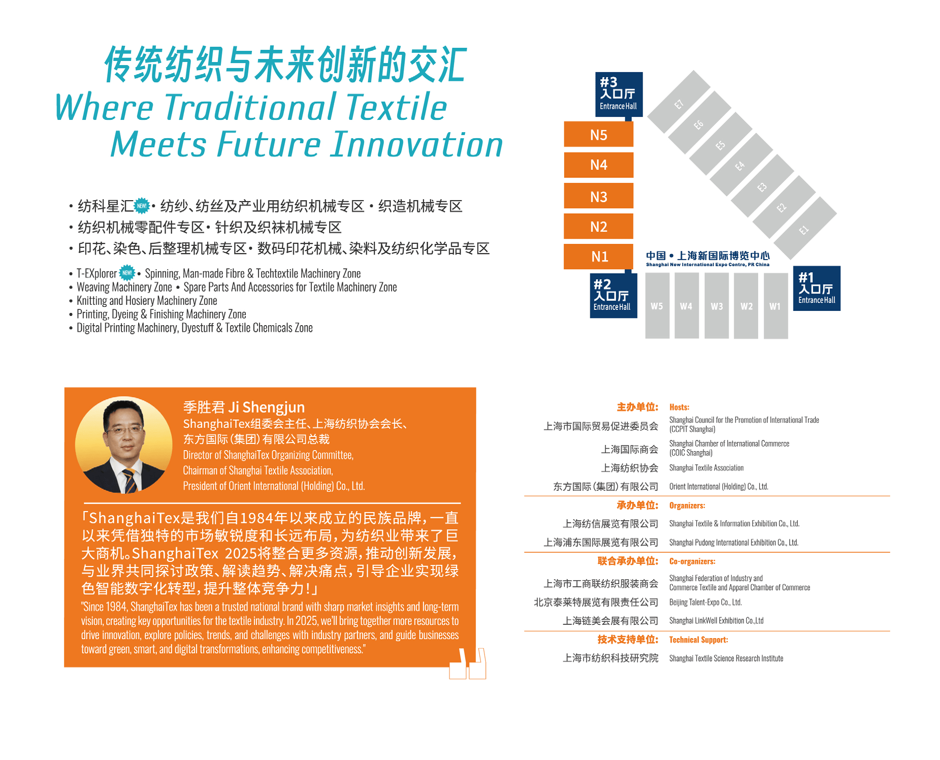 上海国际纺织工业博览会(ShanghaiTex)始创于1984年,是中国汗青最长久的纺织行业嘉会之一,每两年举办一届,努力于鞭策全球纺织行业的科技立异取可持续成长。做为亚洲领先的纺织机械取手艺交换平台,展会通过整合财产链资本,聚焦绿色转型、智能制制和跨界融合,帮力企业应对后疫情时代的市场变化。2025年展会以“同业永续·织动将来”为从题,将沉点展现纺织行业正在可持续材料、数字化出产及智能手艺范畴的前沿,引领全球纺织业向绿色化、智能化标的目的升级。