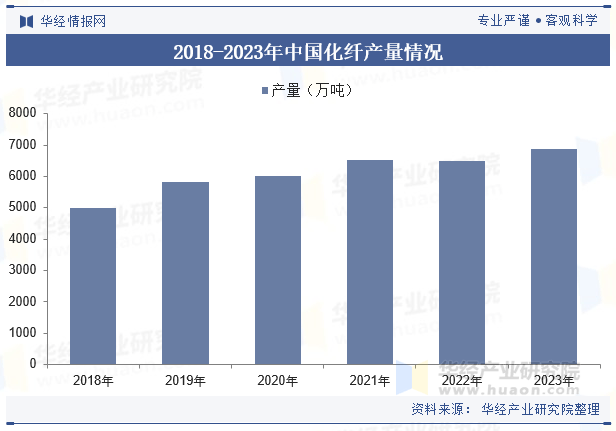 2023年,我国经济恢复成长,呈现回升向好态势,供给需求稳步改善,为纺织化纤财产链平稳运转和成长供给了主要根本前提和积极支持。2023年,化纤产量增速较2022年有所提高。按照中国化纤协会统计,2023年化纤产量为6872万吨。