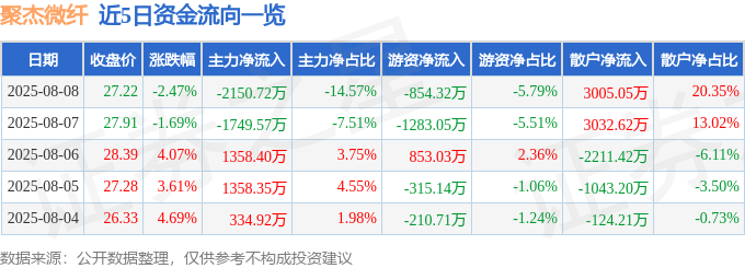 证券之星动静,截至2025年8月8日收盘,聚杰微纤(300819)报收于27。22元,下跌2。47%,换手率4。0%,成交量5。39万手,成交额1。48亿元。8月8日的资金流向数据方面,从力资金净流出2150。72万元,占总成交额14。57%,逛资资金净流出854。32万元,占总成交额5。79%,散户资金净流入3005。05万元,占总成交额20。35%。