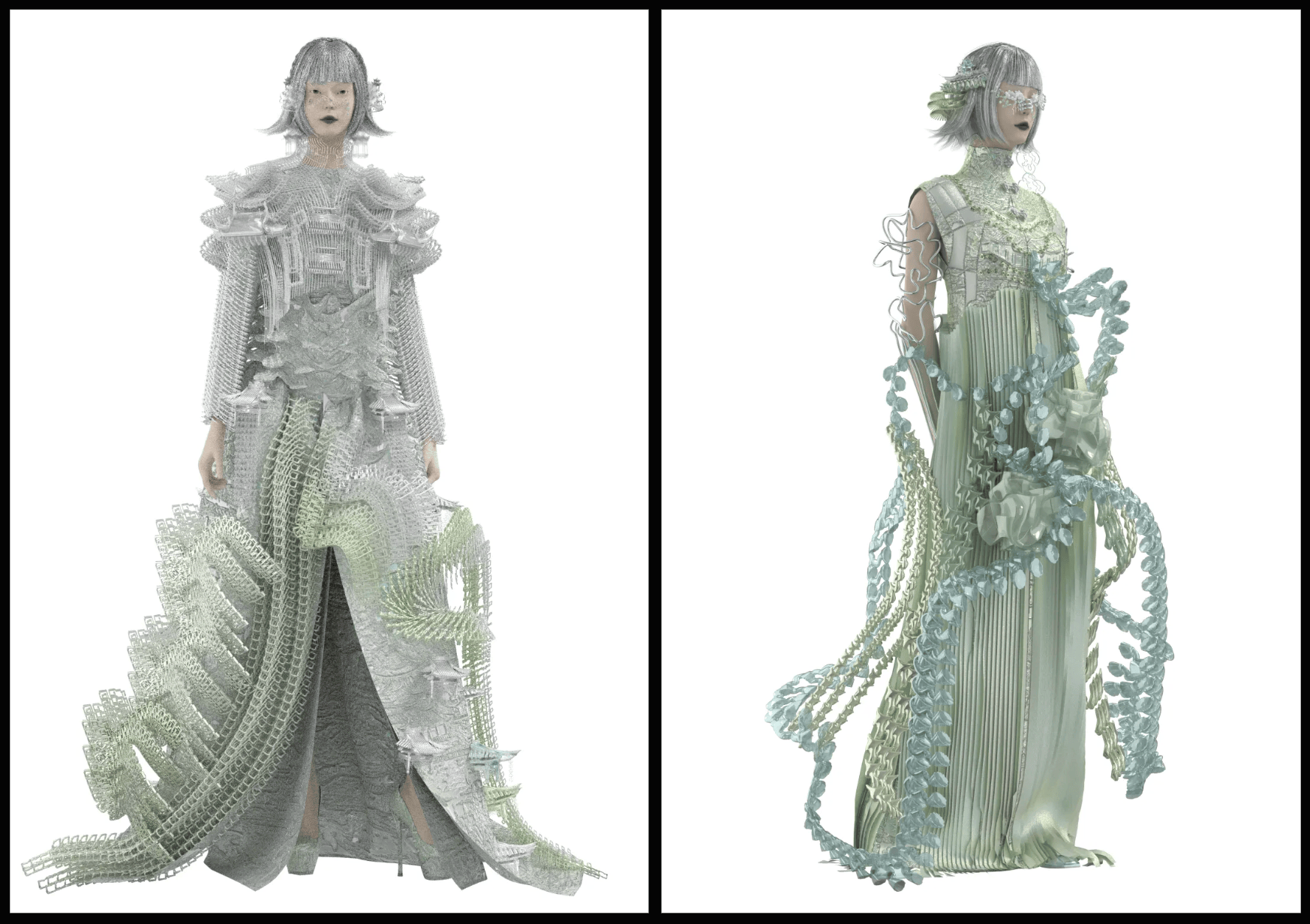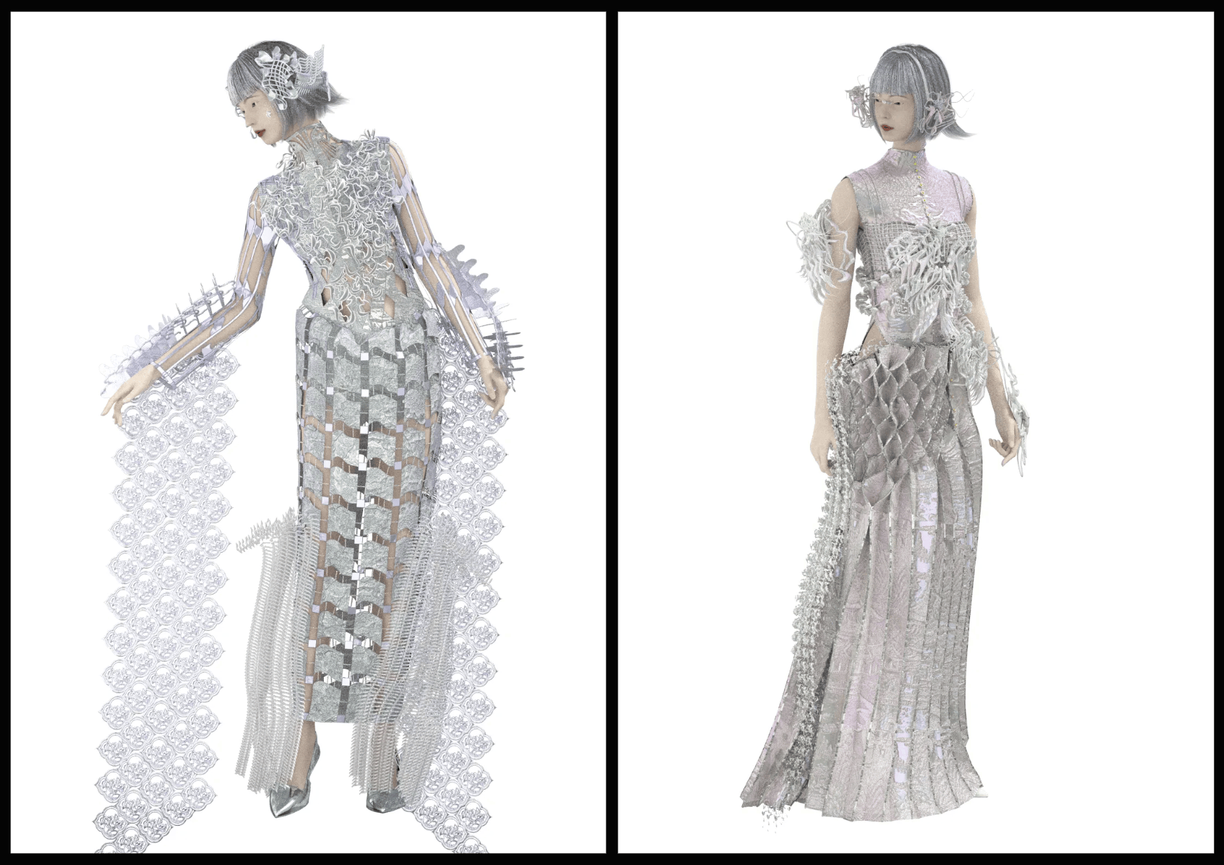 “跃”,这一字眼,更是中国时髦界多年深耕细做、不懈立异取冲破过程的活泼写照,了无数次从量变到量变的飞跃。此次做品将从“跃”出发,以“光子”为灵感,通过展示光子“跃迁”能量的霎时表达对“跃”的憧憬。此次的服拆做品将光子的灵动、跃迁的霎时、能量的迸发交错于一体,创制出虚拟取现实交错的服拆艺术。做品以起承转合保守建建榫卯布局取数字立异相连系,通过用 3D 手艺,充满几何取保守建建轮廓融合中世素,冰凉的机械风取灵动的人体连系,线条健壮又不失美感,采用金属、镭射、荧光等材质面料,结入鸟类取浮雕,构成反射取通明的体例来表达。